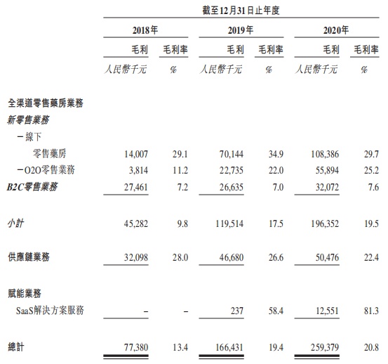 更进一步来看,报告期内公司的全渠道零售药房业务实现毛利由2018年的4528.2万元增加至2020年的1.96亿元,毛利率由9.8%提高至19.5%。同期,供应链业务的毛利由2018年的3209.8万元增加至2020年的5047.6万元,但毛利率由28%下滑至22.4%;赋能业务的毛利由2019年的23.7万元劲增至2020年的1255.1万元,毛利率由58.4%蹿升至81.3%。不难看出,公司最近3个年度的毛利规模和毛利率不断走强,主要得益于公司第一大业务全渠道零售药房表现突出。