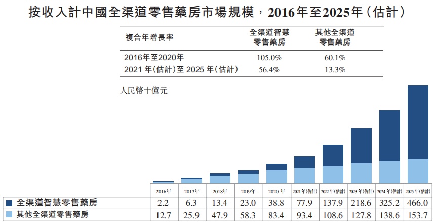 根据弗若斯特沙利文数据,2016年-2020年全渠道零售药房的市场规模由149亿元增长至1222亿元,复合年增长率为69.2%。同时,该机构预测2025年该市场规模将达到4660亿元,2020年-2025年的复合年增长率为37.9%。与此同时,全渠道智慧零售药房在全渠道零售药房市场的占比由2016年的14.8%提高至2020年的31.8%,并有望在2025年达到75.2%。