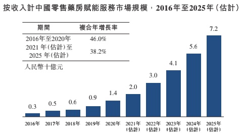 除了主业以外,泉源堂大药房的赋能业务亦颇具想象力。根据弗若斯特沙利文报告,2016年-2020年中国零售药房赋能服务市场规模从3亿元增长至2020年的14亿元,并有望于2025年达到72亿元,2020年-2025年期间复合年增长率高达38.2%。