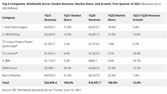 服务器市场排名中,联想(00992)由上个季度(2020年Q4)的第五升至第三,与浪潮并列。联想在第一季度的增幅达到34.9%,为前五大厂商中增长最快,排名第一的戴尔增速为2.4%。