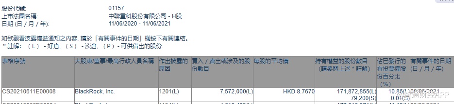 智通财经APP获悉,香港联交所最新资料显示,6月8日,贝莱德减持中联重科(01157)757.20万股,每股作价8.7670港元,总金额约为6638.37万港元。减持后最新持股数目约为1.72亿股,最新持股比例为10.86%。