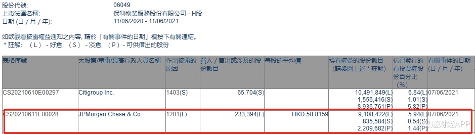 智通财经APP获悉,香港联交所最新资料显示,6月7日,小摩减持保利物业(06049)23.3394万股,每股作价58.8159港元,总金额约为1372.73万港元。减持后最新持股数目约为910.84万股,最新持股比例为5.94%。