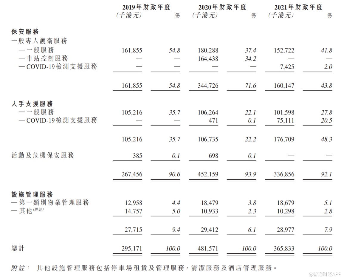 公司为设施服务供应商,专为香港公营及私营部门提供保安服务及设施管理服务。公司在香港为铁路站及设施、海上、陆路及铁路出 入境管制站及公众市容设施提供保安服务以及为多个大型活动及危急及突发事故提供人潮协调及管理服务已有逾十年经验。根据弗若斯特沙利文报告,公司是香港公营部门最大的保安服务供应商,于2020年以收入计占有关市场份额约27.4%。