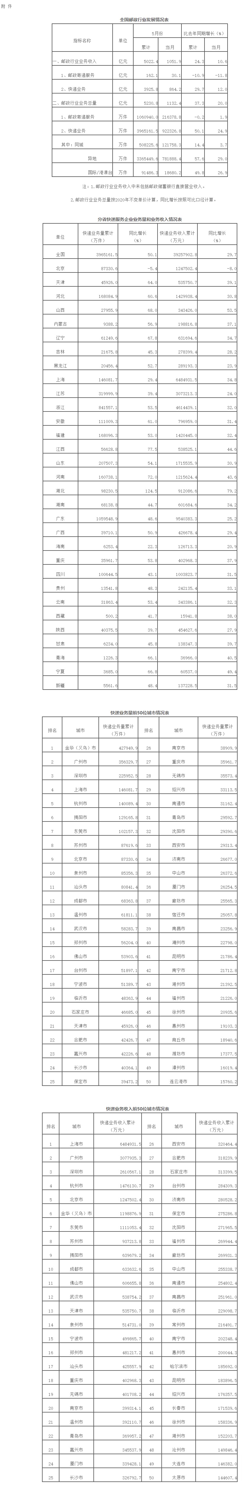 5月份,邮政服务业务总量完成150.3亿元,同比增长3%;邮政寄递服务业务量完成21.6亿件,同比增长1.9%;邮政寄递服务业务收入完成30.1亿元,同比下降11.8%。