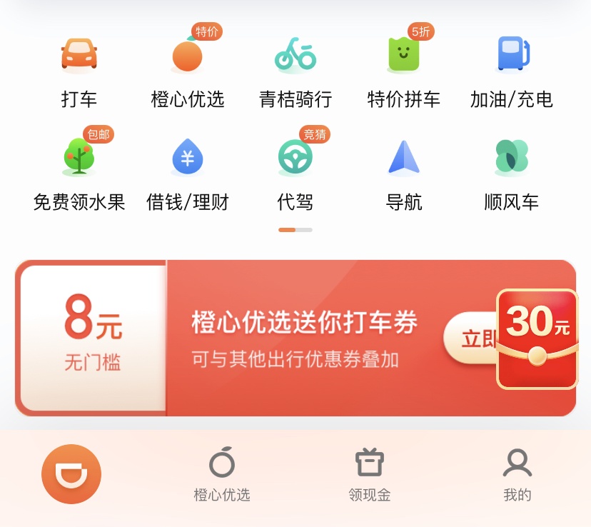 截至目前,在滴滴出行的app上,几乎已经涵盖了打车、特价拼车、顺风车、橙心优选、青桔骑行、理财、导航等多个产品线。
