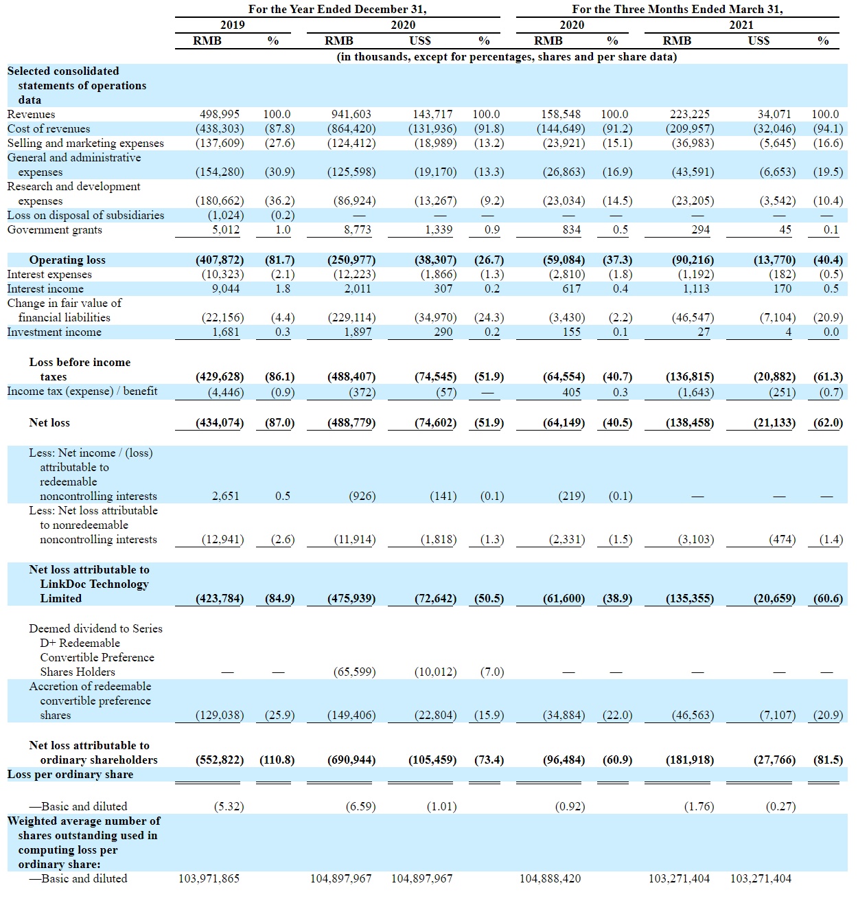 财报显示,2019年、2020年,公司营收分别为4.99亿元(人民币,下同)、9.42亿元,净亏损4.34亿元、4.89亿元,基本及摊薄每股亏损5.32元、6.59元。