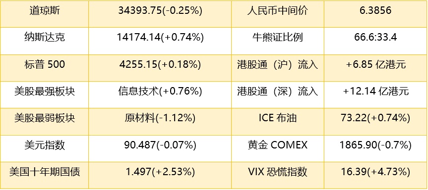 1、 隔夜美股纳斯达克综合指数涨104.72点,涨幅0.74%,报14174.14点;道琼斯指数跌85.85点,跌幅0.25%,报34393.75点;标普500指数涨7.71点,涨幅0.18%,报4255.15点。港股ADR指数上涨,按比例计算,收报29010点,涨167.82点或0.58%。