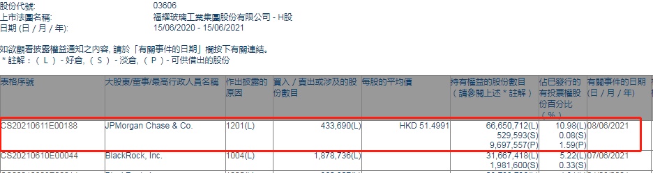 智通财经APP获悉,香港联交所最新资料显示,6月8日,摩根大通减持福耀玻璃(03606)43.369万股,每股作价51.4991港元,总金额约为2233.46万港元。减持后最新持股数目约为6665.07万股,最新持股比例为10.98%。
