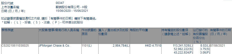 智通财经APP获悉,香港联交所最新资料显示,6月7日,小摩增持鞍钢股份(00347)298.48万股,每股作价4.75港元,总金额约为1418.07万港元。增持后最新持股数目约为1.13亿股,最新持股比例为8.02%。