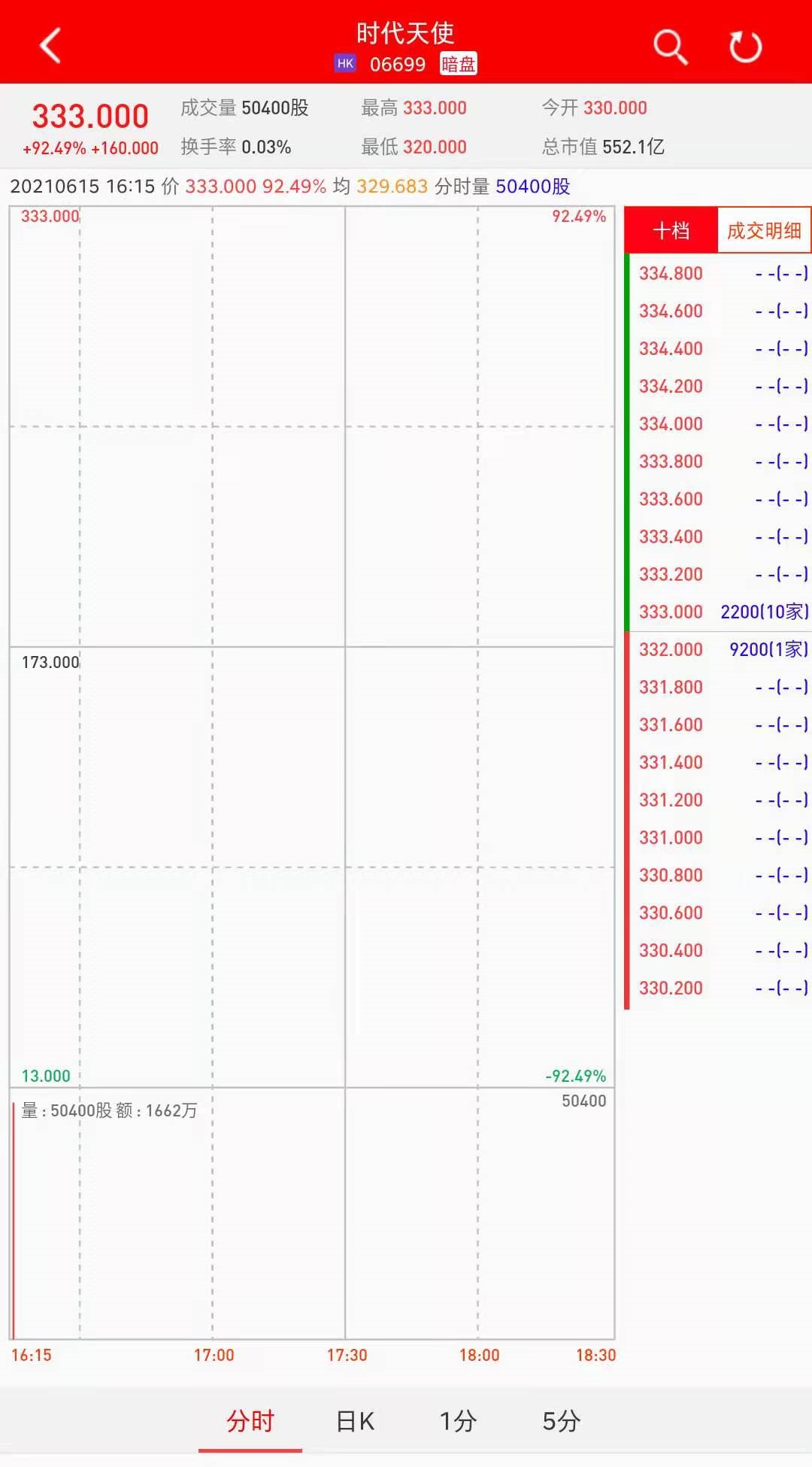 智通财经APP获悉,时代天使(06699)将于6月16日(星期三)在香港挂牌。截至发稿,利弗莫尔证券暗盘交易显示报价333港元,较招股价173港元涨92.49%。每手200股,不计手续费,每手赚32000港元。