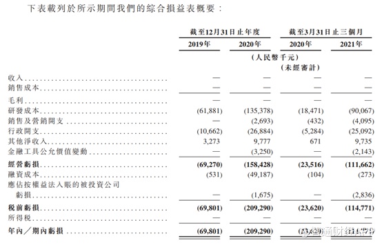 但由于公司尚未有产品商业化,因此公司依旧处于亏损状态。2019年、2020年以及截至2021年3月31日,公司分别亏损人民币6980.1万元(单位下同)、2.09元以及1.15亿元。