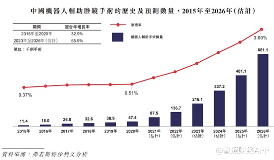 虽然中国引进机器人辅助腔镜手术的时间较美国晚,但其在中国日益普及,主要由于微创伤技术日益成为优先选项以及其在治疗早期前列腺癌等疾病方面的独特优势。2015年至2020年期间,中国进行的整体腔镜手术数量亦快速增长,复合年增长率为24.1%,估计于2020年至2026年间将按16.1%的复合年增长率增长,并预期将推动在中国对于机器人辅助腔镜外科手术的需求进一步增长。根据弗若斯特沙利文的资料,中国每年进行的机器人辅助腔镜手术数量由2015年约11445例增至2020年的47379例,复合年增长率为32.9%,预期将进一步增加至2026年的681098例,自2020年起的复合年增长率为55.9%,2020年及2026年的渗透率分别约为0.5%及3.0%。