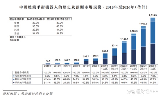 根据弗若斯特沙利文的资料,美国的机器人辅助腔镜手术数量按12.0%的复合年增长率由2015年的50万例增加至2020年的90万例,并预期自2020年起按11.3%的复合年增长率进一步增加至2026年的170万例,2020年及2026年的渗透率分别约为13.3%及23.0%。