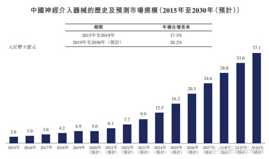 在质量需求推动下,中国的神经介入医疗器械市场规模从2015年的26亿元增至2019年的49亿元,年复合增长率为17.3%。预计到2030年,该市场将进一步增至371亿元,2019-2030年的年复合增长率为20.2%,可见这一蓝海市场潜力巨大。