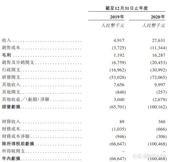 数据显示,2019年和2020年,公司的研发开支总额为5300万元及7210万元,分别占收入的1078.5%及260.8%。同期销售及分销开支为680万元及2050万元,分别占收入的137.5%及74%。行政开支为1700万元及3100万元,分别占收入的345%及112.2%。