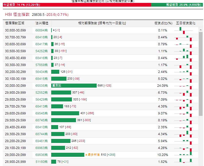 法兴恒指牛熊证街货分布图中的数据显示,熊证街货重货区在30000-30099区间,该区间最新熊证数量为696张,较上一交易日减少128张;最多新增在29000-29099区间,该区间最新熊证数量为510张,较上一交易日增加288张。
