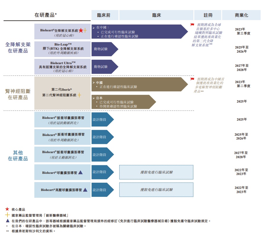该公司核心产品Bioheart®是用于治疗冠状动脉疾病的经皮冠状动脉介入治疗手术中使用的自主研发全降解支架系统。根据弗若斯特沙利文资料,该公司是中国仅有的三家拥有处于临床试验阶段的第二代全降解支架产品的国内公司之一及仅有的两家已于中国启动随机对照临床试验(RCT)的国内公司之一。