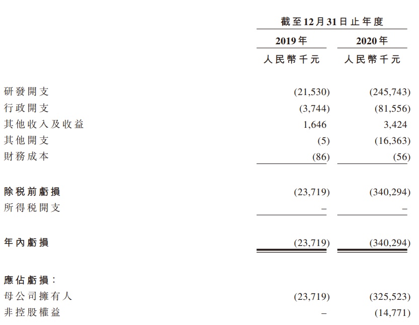财务方面,招股书透露,该公司目前尚无获批准用于商业销售的产品,于往绩记录期间亦无从产品销售中产生任何收益。该公司2019及2020年年内亏损分别为人民币2371.9万元、人民币3.40亿元。