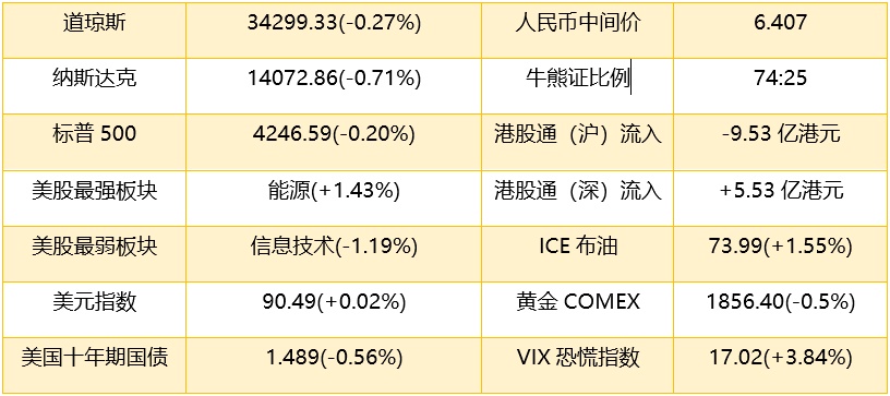 1、 隔夜美股道琼斯指数跌94.42点,跌幅0.27%,报34299.33点;纳斯达克综合指数跌101.29点,跌幅0.71%,报14072.86点;标普500指数跌8.56点,跌幅0.2%,报4246.59点。港股ADR指数下跌,按比例计算,收报28541点,跌96.68点或0.34%。
