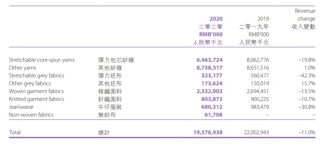受到疫情影响,2020年公司业务几乎全线下跌,其中纱线业务营收为152亿元,占总营收比例为77.7%,同比下降18.8%。胚布产品、梭织面料、针织面料、牛仔服、无纺布(2020年新增)收入占总营收比例分别为2.5%、11.9%、4.1%、3.5%、0.3%,同比分别为下降26.6%、13.5%、10.7%、30.8%。