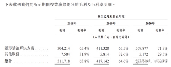 比起快速的增长速度,令人瞩目的恐怕是公司的毛利率水平。据招股书显示,2018年至2020年,公司的毛利率分别为63.8%、64.6%及70.4%,得益于公司主要业务毛利率的提升,隐形矫治解决方案毛利率从2018年的65.4%提升至2020年的71.3%。除了毛利率逐年提升外,公司的经调整净利率亦逐年提升,期内经调整净利率期内分别为18.9%、20.1%及27.8%。