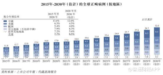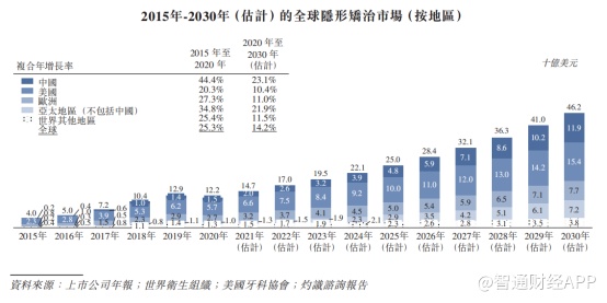 根据灼识咨询数据显示,中国隐形矫治市场在2019年成为世界第二大市场。就零售销售收入而言,市场规模由2015年的2亿美元增至2020年的15亿美元,复合年增长率为44.4%,并有望于2030年达到119亿美元,自2020年至2030年的复合年增长率预计为23.1%。此外,中国通过隐形矫治器解决的正畸案例数目由2015年的4.78万例增至2020年的33.55万例,复合年增长率为47.7%,并预期将于2030年达到380万例,复合年增长率为27.6%。