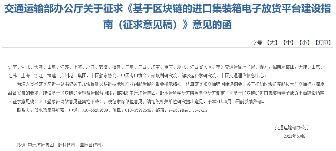 智通财经APP获悉,交通运输部办公厅发布了关于征求《基于区块链的进口集装箱电子放货平台建设指南(征求意见稿)》意见的函。函中提到,为建设基于区块链的全球航运服务网络,交通运输部组织中远海运集团、部水运科学研究院等单位研究制定了《基于区块链的进口集装箱电子放货平台建设指南(征求意见稿)》并征求相关单位意见。