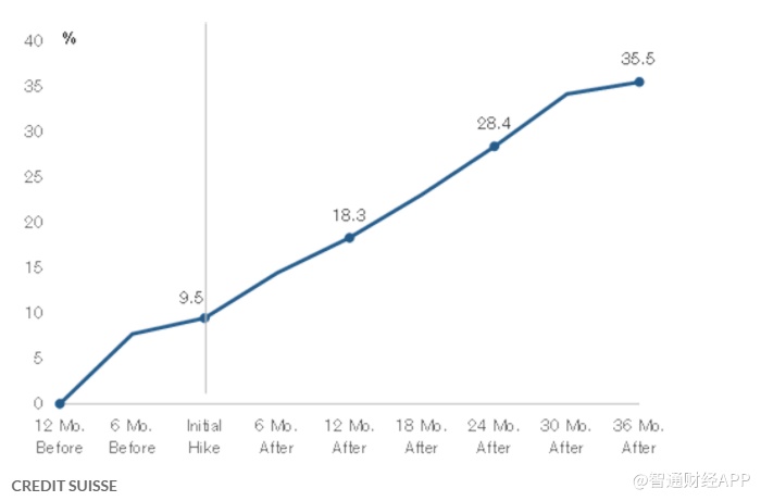 一些美联储官员已经暗示准备开始讨论缩减资产购买,与此同时,加息预期也在逐渐升温。在回顾1994年、1999年、2004年和2015年的加息周期时,瑞士信贷发现,在美联储首次加息前的12个月以及加息后的36个月,股市回报率保持稳健,只有当美债收益率曲线趋于平缓时,股市回报率才会减弱。