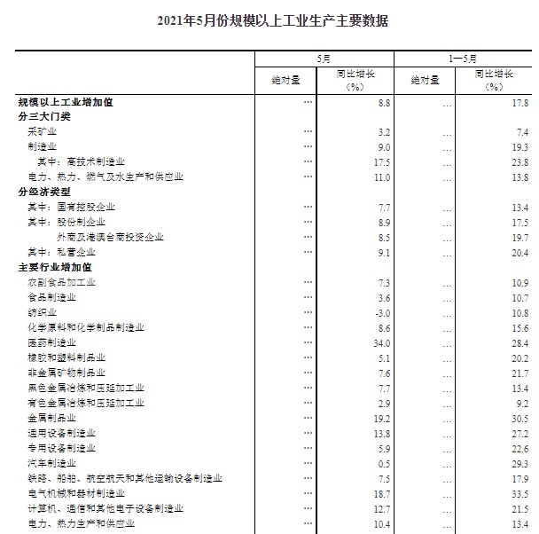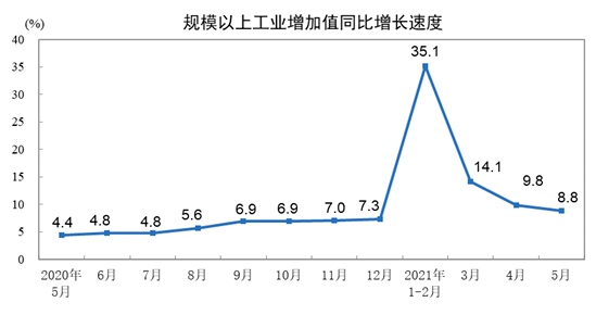 智通财经APP获悉,6月16日,国家统计局公布,5月份,规模以上工业增加值同比实际增长8.8%(以下增加值增速均为扣除价格因素的实际增长率),比2019年同期增长13.6%,两年平均增长6.6%。从环比看,5月份,规模以上工业增加值比上月增长0.52%。1—5月份,规模以上工业增加值同比增长17.8%,两年平均增长7.0%。