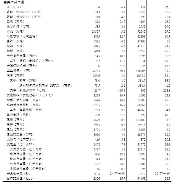 分产品看,5月份,612种产品中有428种产品产量同比增长。钢材12469万吨,同比增长7.9%;水泥24307万吨,下降3.2%;十种有色金属545万吨,增长10.3%;乙烯228万吨,增长23.7%;汽车209.6万辆,下降4.0%,其中,新能源汽车23.7万辆,增长166.3%;发电量6478亿千瓦时,增长7.9%;原油加工量6050万吨,增长4.4%。