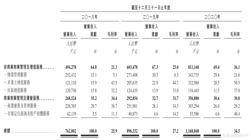 在具体的业务布局方面,公司主要将营业收入根据业务条线划分为非商业物业管理及增值服务、商业物业管理及运营服务两大业务分部。其中,商业物业管理及运营服务主要包括(i)商业运营及管理服务;及(ii)市场定位咨询及租户招揽服务。