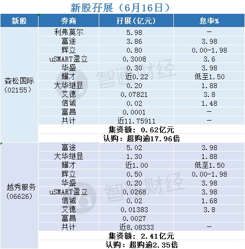 智通财经APP获悉,森松国际(02155)、越秀服务(06626)正在招股中。截至6月16日,富途、辉立、耀才等合计分别为其借出近11.75911亿港元及近8.08333亿港元;其中,森松国际超购逾17.96倍,越秀服务超购逾2.35倍。