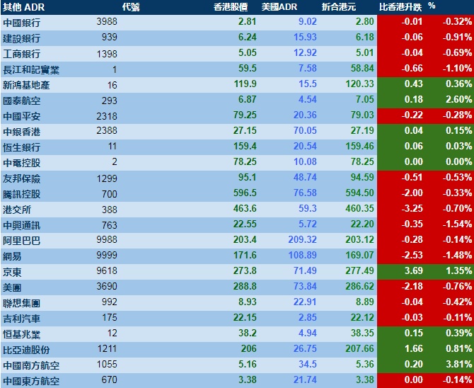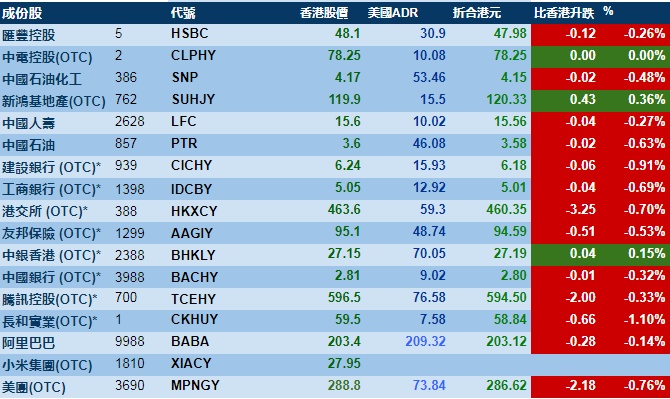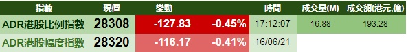智通财经APP获悉,周三美股三大指数齐跌,港股ADR指数也跌,按比例计算,收报28308点,跌127.83点或0.45%。