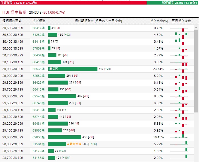 法兴恒指牛熊证街货分布图中的数据显示,熊证街货重货区在30000-30099区间,该区间最新熊证数量为717张,较上一交易日增加21张;最多新增在28900-28999区间,该区间最新熊证数量为263张,较上一交易日增加185张。