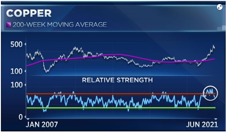 Maley表示,例如,铜近期的“超买状态超过了2011年的峰值水平”,他认为,这是其他大宗商品价格的“代表”。