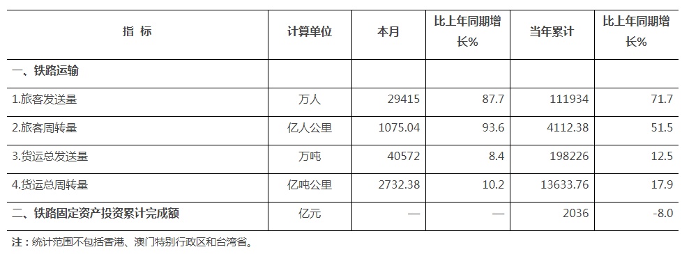 2021年5月份全国铁路主要指标完成情况