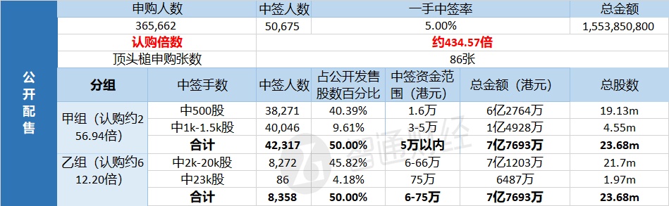 其中,公开配售申购人数为365,662,一手中签率5.00%,认购倍数约434.57倍。