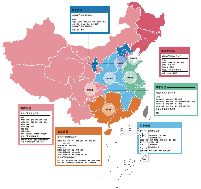 截至2021年3月末,长城物业的物业管理业务分布在国内31个省、直辖市和自治区的162个城市,62.4%的在管建筑面积位于一线或新一线城市。其中,公司管理的众多物业为其所在城市的地标建筑,包括上海虹桥世界中心、宁波绿地中心、西安绿地中心、乌鲁木齐绿地中心、苏州繁花中心、济南铜锣湾广场、太原缤纷时代广场、天津金座广场、南昌紫峰大厦及无锡东岭锡上购物中心。