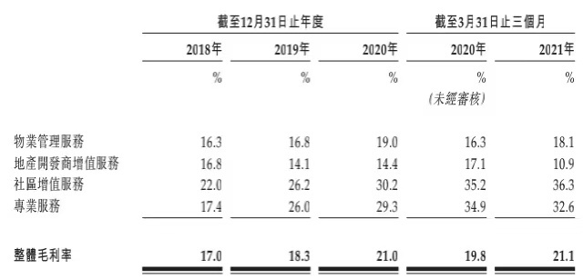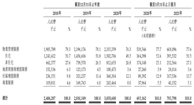 先来看公司的收入情况,招股书显示长城物业的业务包括了物业管理服务、地产开发商增值服务、社区增值服务及专业服务四个板块。按收入规模划分,物业管理服务为公司第一大业务,2018年-2020年分别实现收入19.06亿元、21.96亿元、23.15亿元,占总收入的比重达到79.3%、78.1%、76.3%。