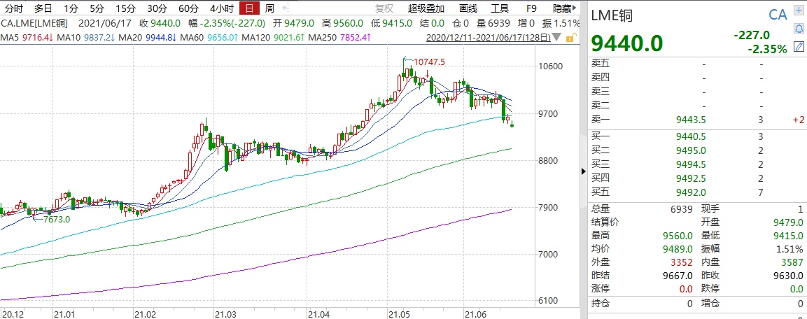国际市场上,截至6月17日发稿时间,LME铜(CA)下跌了2.35%,报于9440美元/吨,离5月中旬的一万美元大关渐行渐远。