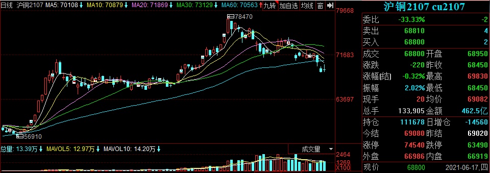 国内市场上,截至6月17日收盘,沪铜2107则下跌0.32%,报于68800元/吨。现货铜——电解铜均价则下跌0.17%至69170元/吨。