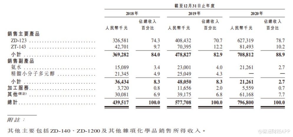 招股书显示,正大新材料中国最大的聚醚胺产品制造商,主要以“正大新材”品牌从事聚醚胺产品的研发、生产及销售。公司的产品组合,分为三大类,即单胺、二胺及三胺(其差别乃由产品的核心聚醚主链结构确定),三者均可根据化学结构基于环氧丙烷(PO)、环氧乙烷(EO)或两者的混合比例进一步分类。公司的主要产品为ZD-123及ZT-143,两种产品于2020年实现营收7.09亿元(人民币)占营收比重达到88.9%。