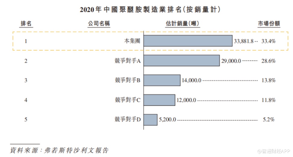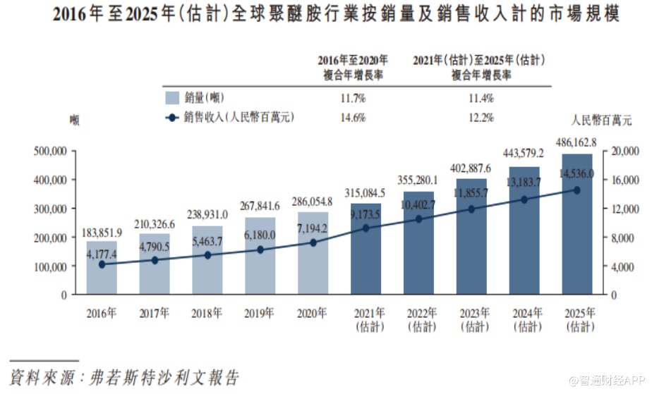 由于风电及建筑等行业对聚醚胺需求增长,中国聚醚胺产品处于供不应求状态。弗若斯特沙利文报告显示,2020年,中国聚醚胺行业的市场规模按产量计为7.98万吨,而同期销量达到10.13万吨。