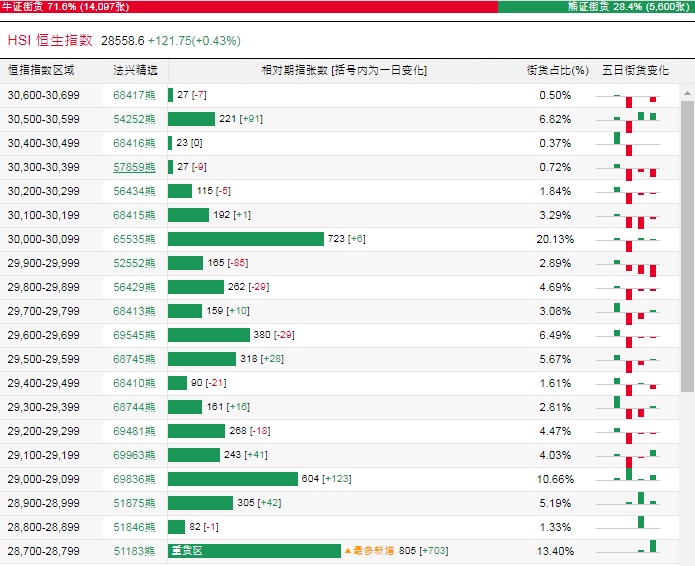 法兴恒指牛熊证街货分布图中的数据显示,熊证街货重货区和最多新增都在28700-28799区间,该区间最新熊证数量为805张,较上一交易日增加703张。