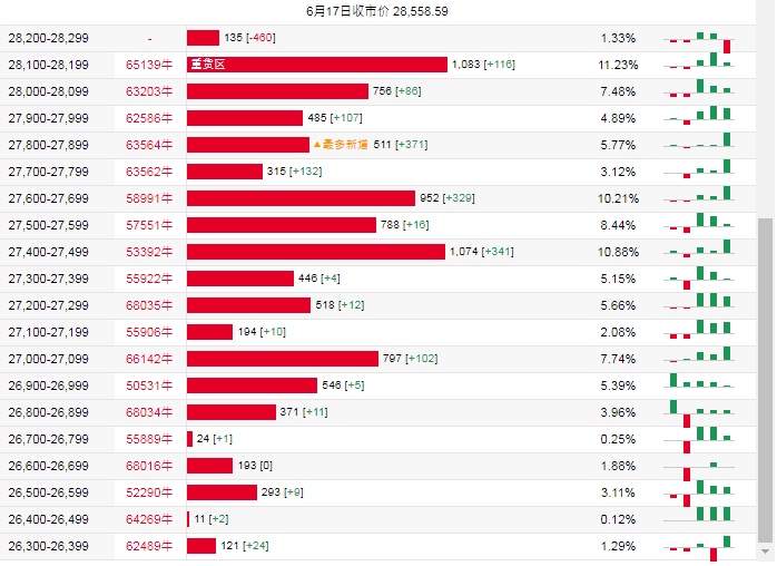 牛证街货重货区在28100-28199区间,该区间最新牛证数量为1083张,较上一交易日增加116张。最多新增在27800-27899区间,该区间最新牛证数量为511张,较上一交易日增加了371张。