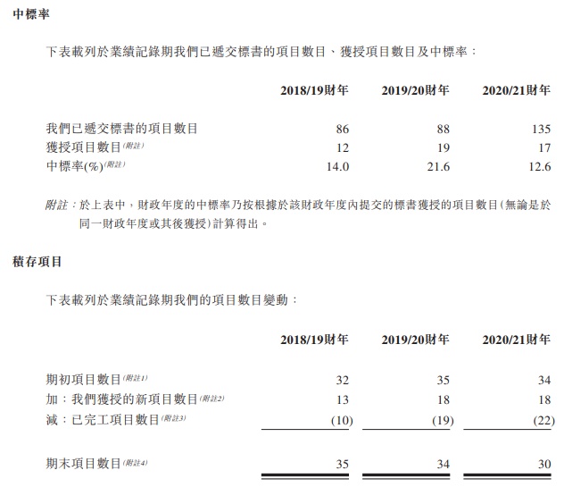 该公司主要于香港从事私营界别项目,同时也在较小范围内于香港从事公营界别项目,于业绩记录期,该公司的大部分收益来自住宅发展项目的泥水工程。另外,该公司中标率于2018/19财年、2019/20财年、2020/21财年分别为14.0%,21.6%,12.6%。