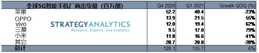 智通财经APP获悉,据Strategy Analytics最新发布的研究报告,全球5G智能手机出货量环比增长6%,在2021年Q1达到创纪录的1.36亿部。Strategy Analytics预测,2021年全年全球5G智能手机出货量将达到创纪录的6.24亿部,远高于2020年全年的2.69亿部。其中,2021年Q1,三星和vivo成为全球增长最快的5G智能手机厂商。三星5G智能手机出货量环比增长79%,为1700万部;vivo环比增长62%,出货量为1900万台;小米(01810)环比增幅为41%排名第四。与此同时,在经历2020年Q4新一代5G iPhone作为圣诞礼物大热后,该季度苹果(AAPL.US)5G iPhone出货量环比下降23%。