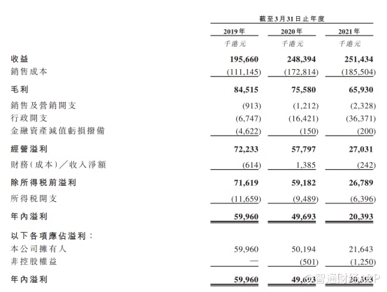 业绩上来看,中卓医务表现并不好。2018-2020财年,公司实现营收分别为1.96亿港元、2.48亿港元以及2.51亿港元,分别同比增长26.53%以及1.21%。尽管营收实现增长,但净利润却逐年下降,2018-2020财年公司溢利分别为5996万港元、4969.3万港元以及2039.3万港元,分别同比下降17.12%及58.96%。