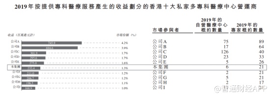 凭借着6个医疗中心以及21位专家,中卓医务在竞争激烈的香港民营医院市场取得一席之地,根据弗若斯特沙利文,按提供专科医疗服务产生的收益划分,2019年公司约占市场份额的1.3%;并且在2019年按收益划分的香港十大私家多专科医疗中心营运商中,中卓医务每名内科医生的收益方面排名第一,内科医生所产生的总收益方面排名第三,提供专科医疗服务(包括内科及外科手术相关的专科服务)所产生总收益方面排名第六。