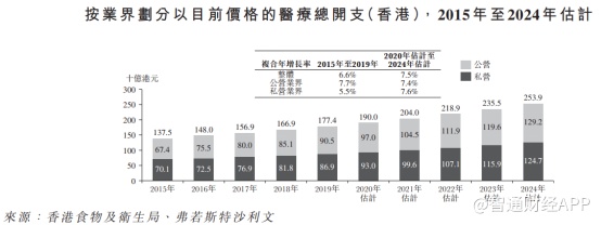 人口数量增加,导致医疗总开支也有所增加。从2015年的1375亿港元增至2019年的1774亿港元,年复合增长率约为6.6%。在人口老化及对医疗保健服务的需求增加的推动下,弗若斯特沙利文预计从2020年到2024年,香港医疗总开支将以约7.5%的复合年增长率增长。特别是,受益于保险购买增加及政府推动的自愿医保计划,预计从2020年到2024年,私家医疗保健开支的复合年增长率约为7.6%。